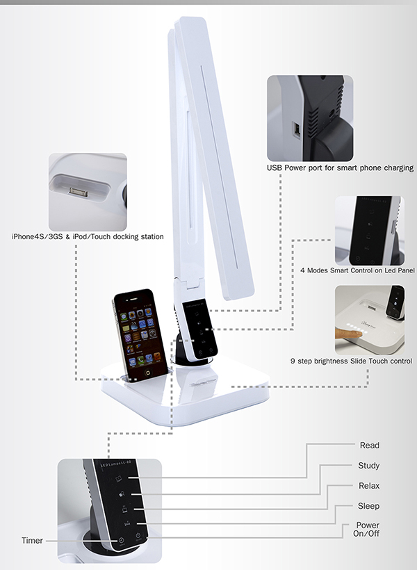- iLUX LL03 - όλα τα χαρακτηριστικά του LL01, με επιπλέον δυνατότητα φόρτισης iPhone 5/5S/5C σε lighting docking station και 9 στάδια ρύθμισης φωτεινότητας.